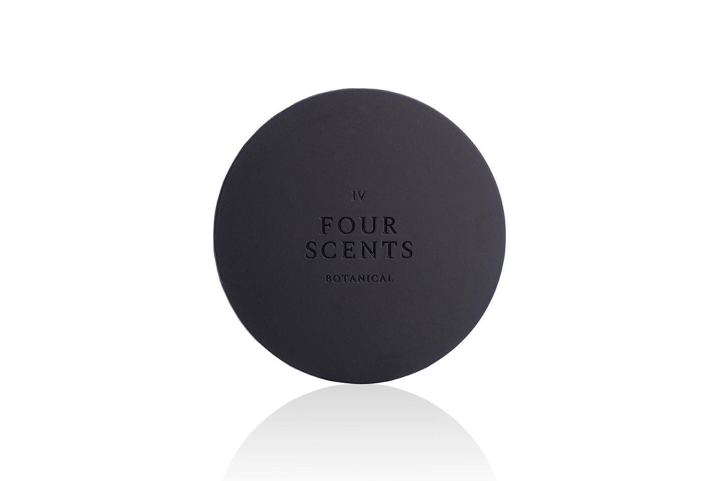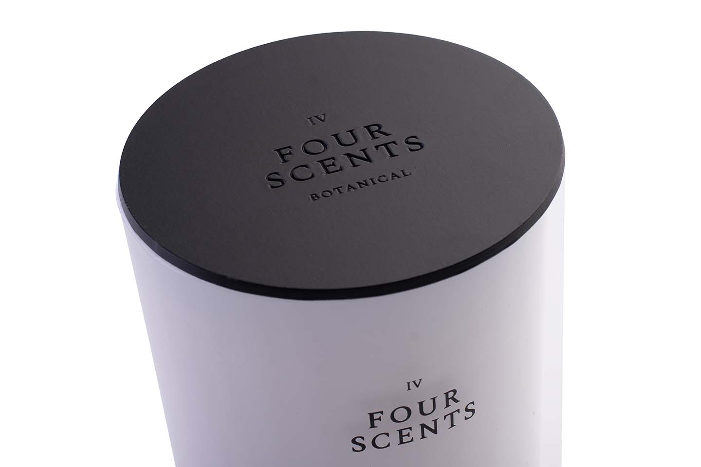 Close Up of Candle Lid Embossed with Four Scents Logo Covering Top of Four Scents Candle